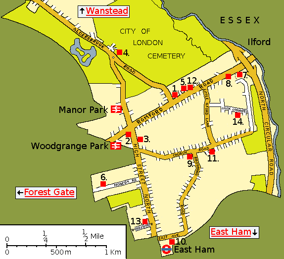 | Manor Park got it's name from a 19th century railway station. Before that and well into the 20th century it was known as Little Ilford. This distinguished it from Great Ilford on the other side of the river Roding. The Roding was originally called the Hile and so the houses by the ford of the Hile were known as Ilford. Little Ilford was an appropriate name, as it was the smallest parish in the Becontree Hundred and the Domesday Book stated that it only had 10 inhabitants. The name Manor Park was given to the station because of the manor house called Aldersbrook house which used to be near to the present City of London Cemetery and Manor Farm which was close to the present Library. In the 14th century the house was known as Naked Hawe House. In the 16th century it was owned by the Heron family, one of whom married the daughter of Sir Thomas More. Later it belonged to Robert Dudley, Earl of Leicester, who was a favourite of Queen Elizabeth 1. |